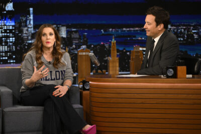 Photo Credit: Todd Owyoung/NBC (Drew Barrymore during an interview with host Jimmy Fallon)