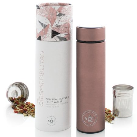 The Cosmopolitan is very adaptable. It’s a combination of a tea infuser, coffee thermos, cold brew coffee maker, fruit water infuser, sports water bottle, plus more. I started by using my tumbler to hold my freshly brewed coffee. The next day I used it with tea and the stainless steel two-way filter was perfect for brewing my vanilla/chai infusion. The water stays hot for hours. If you’re inclined to use loose leaf teas then the strainers do a great job at keeping sediment from floating around in your drink. Standard infusers have 1mm holes – these containers are .5mm for a more refined brew.
